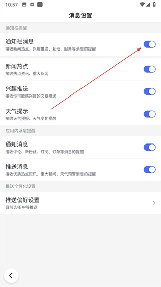 4、找到通知欄消息選項,點擊開關(guān)將其關(guān)閉。