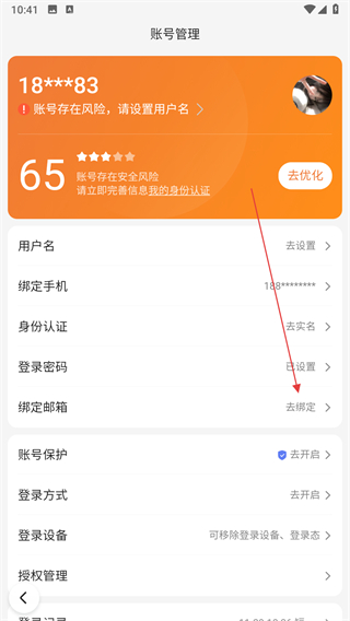 3、在賬號管理頁面里,找到綁定郵箱選項并點擊,進(jìn)入綁定郵箱頁面。