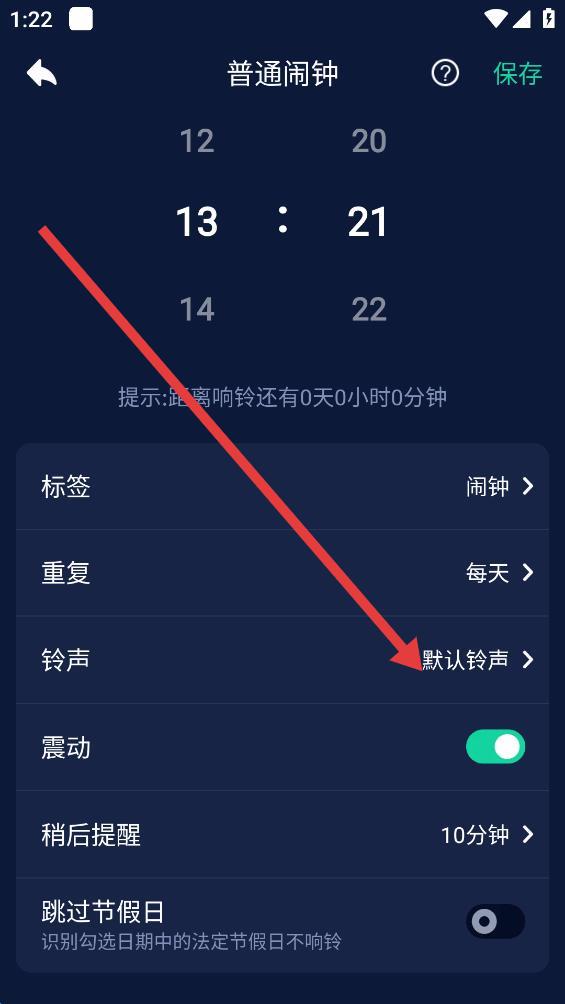 3、在鬧鐘設(shè)置界面里,找到鈴聲選項(xiàng),點(diǎn)擊其右側(cè)的默認(rèn)鈴聲。