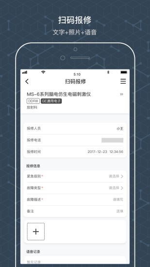 含有掃碼報修服務(wù),可自行上傳文字、圖片和語音等報修信息;