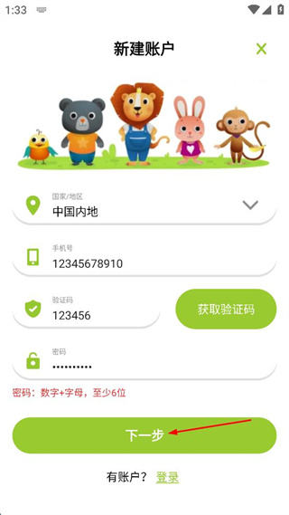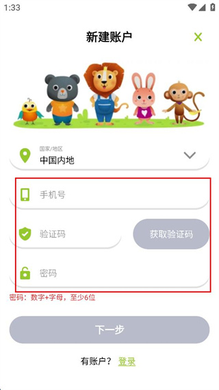 3、在新建賬戶頁面輸入手機號、驗證碼和密碼,準(zhǔn)備進行注冊操作。