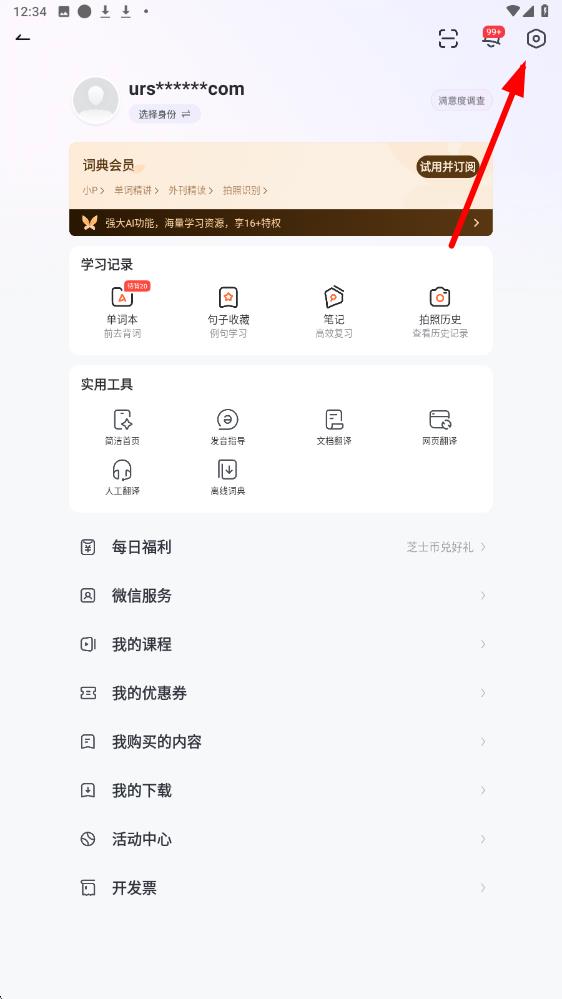 1、打開網(wǎng)易有道app,左上角頭像進(jìn)入個(gè)人頁面,點(diǎn)擊右上角設(shè)置圖標(biāo)進(jìn)入設(shè)置界面。
