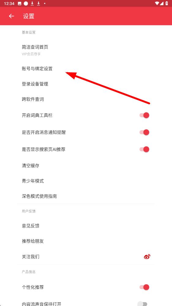 2、在設(shè)置界面中,找到賬號與綁定設(shè)置選項(xiàng),點(diǎn)擊進(jìn)入賬號相關(guān)設(shè)置頁面。