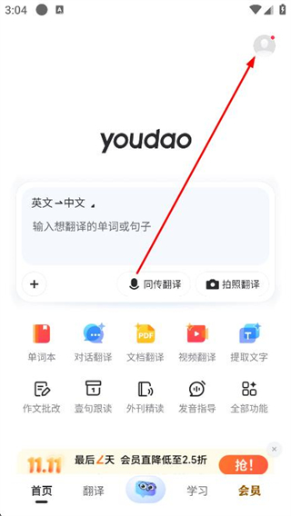 1、打開有道詞典APP,點(diǎn)擊右上角的頭像圖標(biāo)。