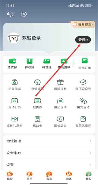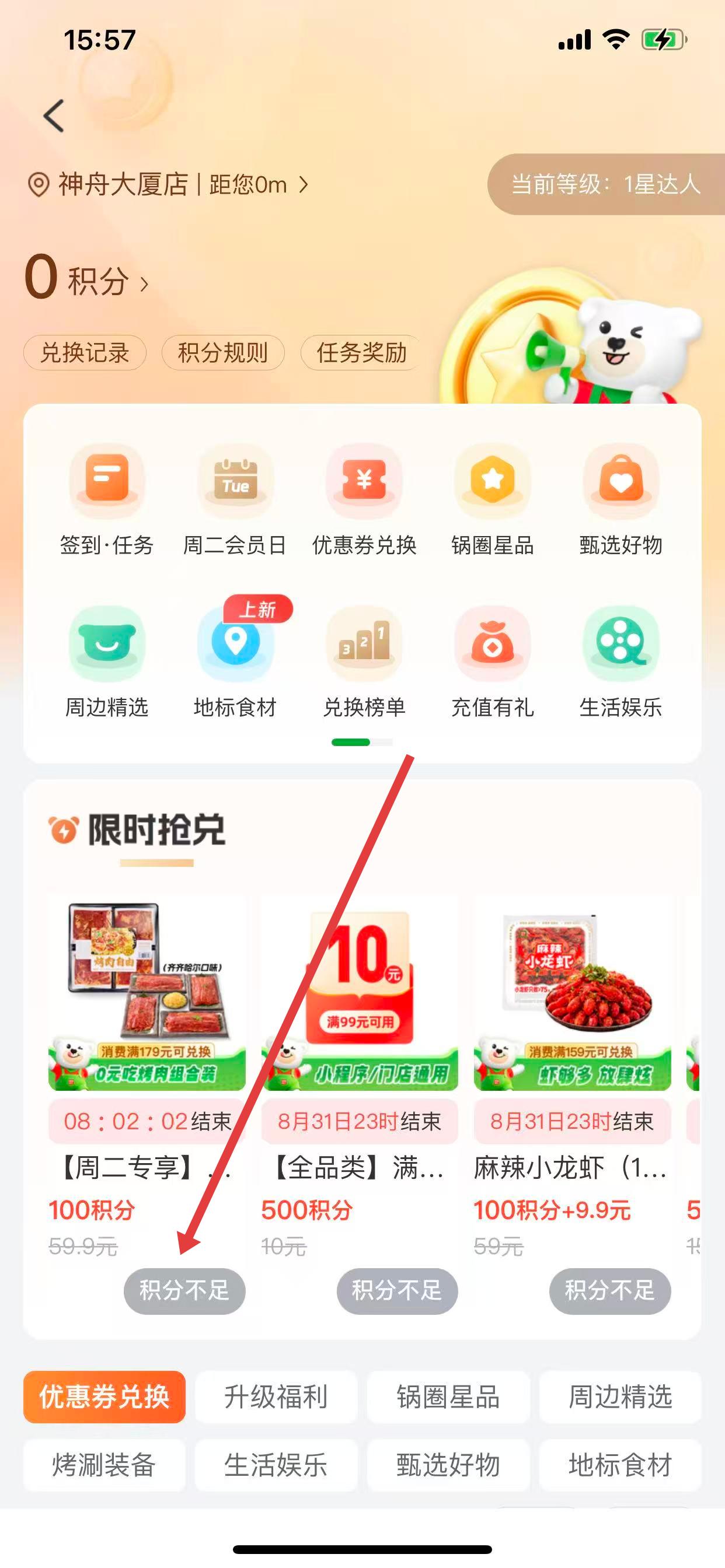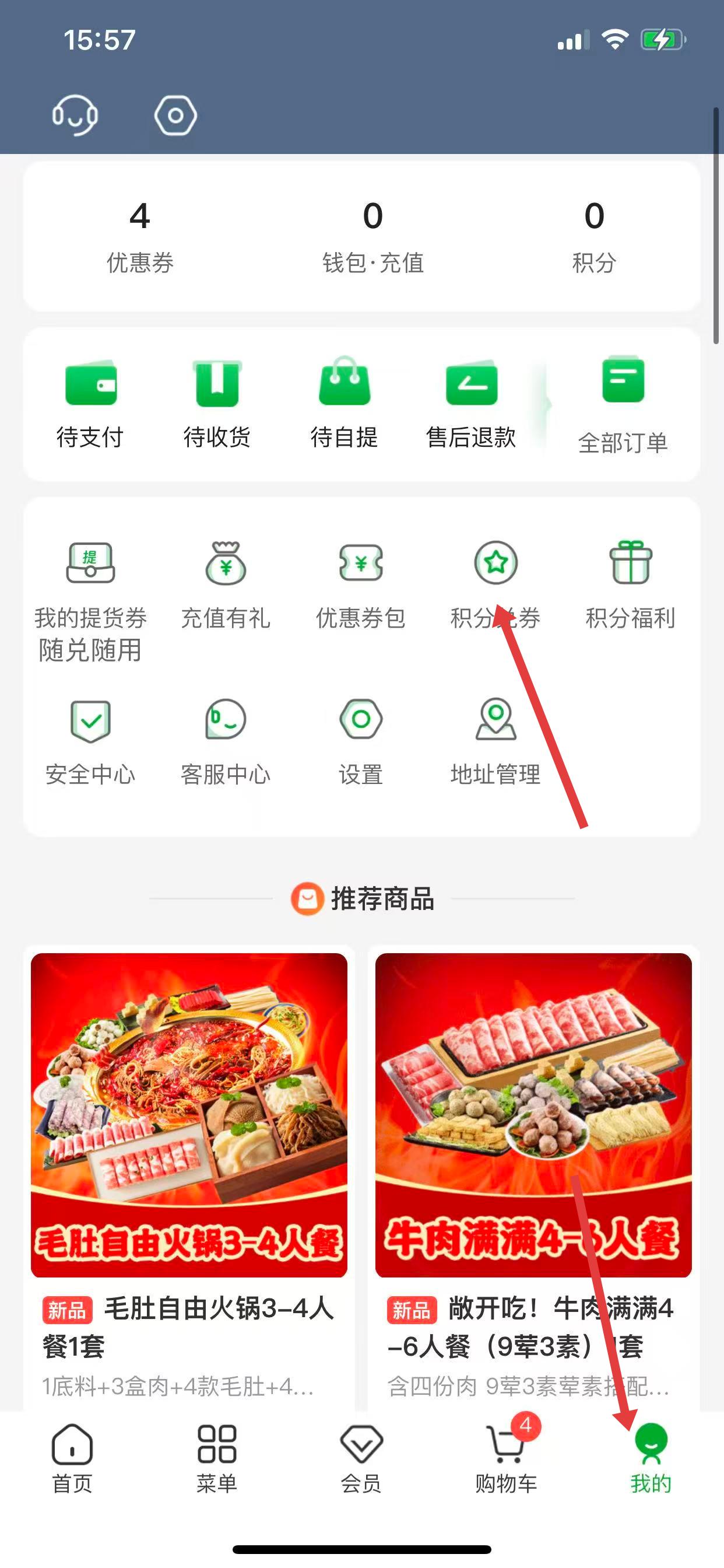1、打開鍋圈小程序或APP,進(jìn)入我的選項(xiàng),找到并點(diǎn)擊積分兌券選項(xiàng)。