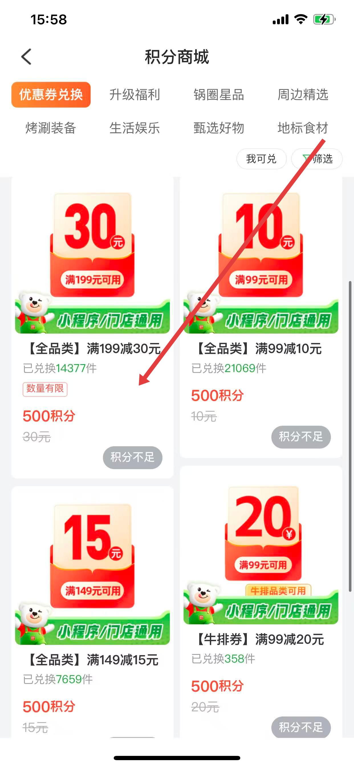 2、進(jìn)入積分兌換優(yōu)惠券界面后,瀏覽可兌換的優(yōu)惠券列表,滿199減30元、滿99減10元等優(yōu)惠券。