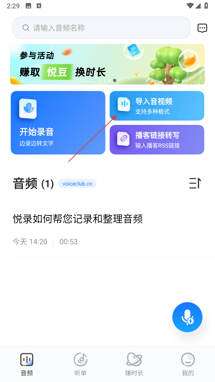 1、打開悅錄應(yīng)用,在主界面點(diǎn)擊導(dǎo)入音視頻按鈕。