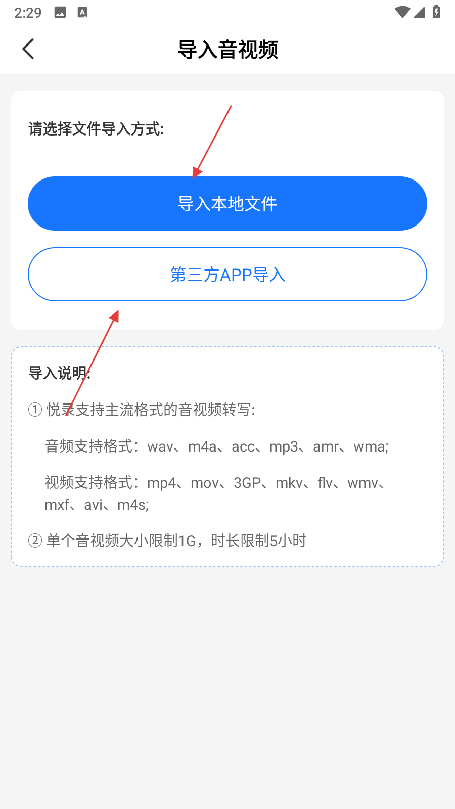 2、進(jìn)入導(dǎo)入音視頻頁面,頁面會(huì)展示導(dǎo)入本地文件和第三方APP導(dǎo)入兩種方式。