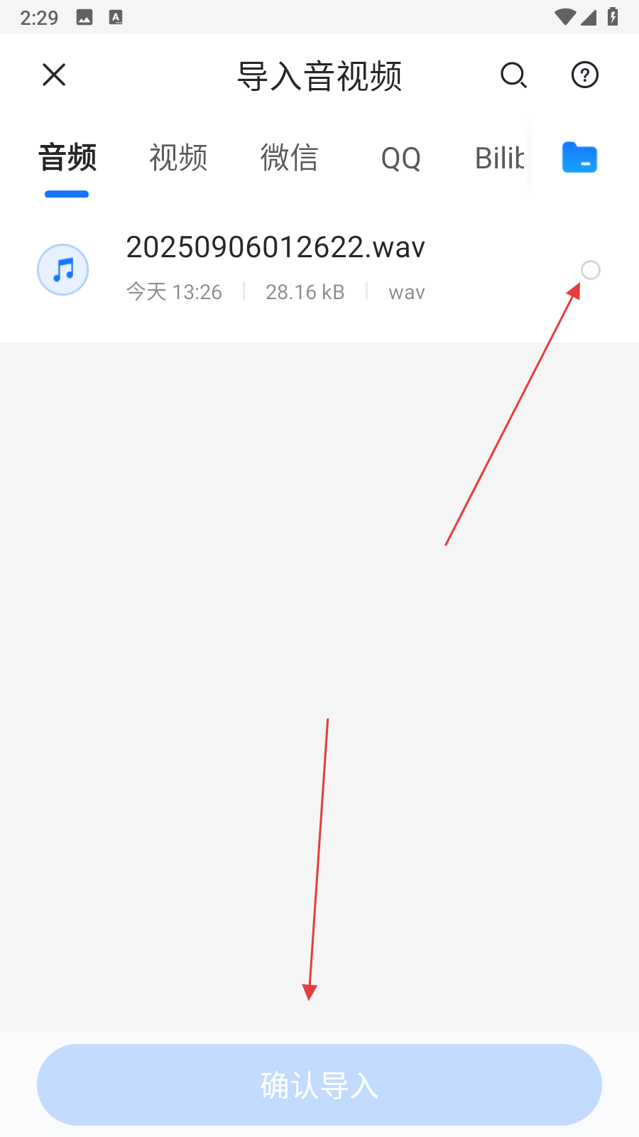 3、選擇導(dǎo)入本地文件,點(diǎn)擊后會(huì)進(jìn)入本地音視頻選擇界面,在該界面中找到并勾選需要導(dǎo)入的音視頻文件,接著點(diǎn)擊確認(rèn)導(dǎo)入按鈕。
