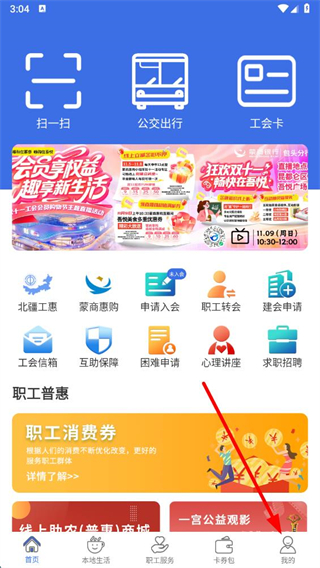 1、在鹿城職工普惠app首頁(yè),點(diǎn)擊右下角我的進(jìn)入個(gè)人頁(yè)面。