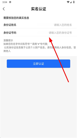 3、在實(shí)名認(rèn)證頁(yè)面,輸入身份證姓名和身份證號(hào)碼,點(diǎn)擊立即認(rèn)證完成身份核驗(yàn)。