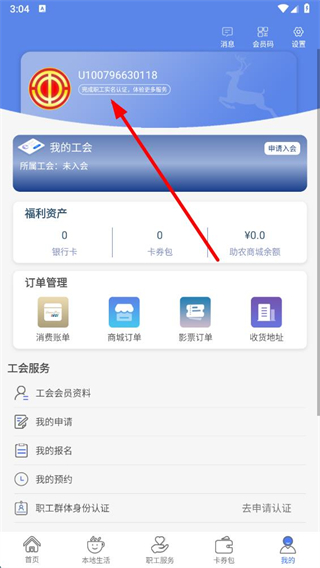 2、在個(gè)人頁(yè)面,點(diǎn)擊完成職工實(shí)名認(rèn)證,進(jìn)入實(shí)名認(rèn)證流程。