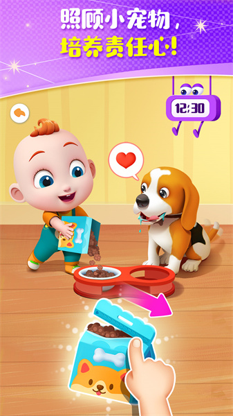 是誰在汪汪叫?是小狗Bingo!它的肚子快餓癟了,需要進行喂食,寶寶來幫幫忙:撕開狗糧袋,倒?jié)M寵物餐盆。Bingo好像沒吃飽?使用開罐器,再為它開一個寵物罐頭吧。Bingo出去“兜風”咯!呀,它玩得一身臟,還需趕緊清洗:用夾子,清理Bingo身上的雜草;舉起刷子,刷洗爪子上的泥塊;為浴花擠上沐浴露,還能給Bingo做個泡泡Spa。