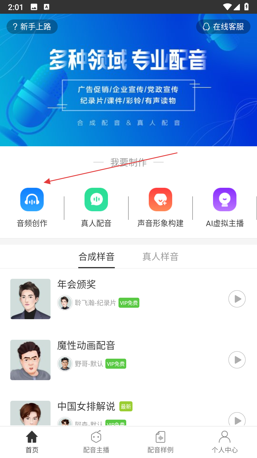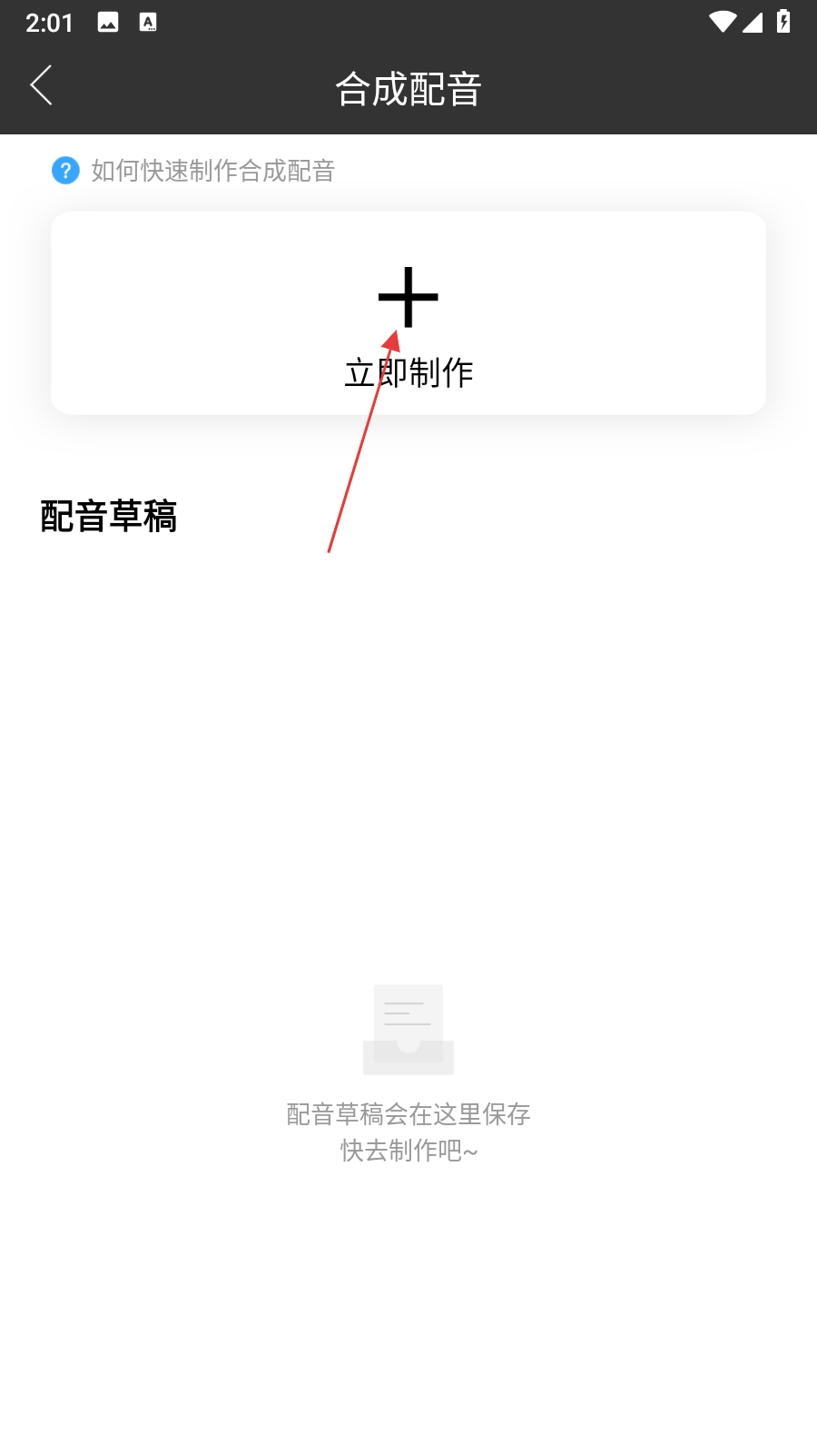 1、打開訊飛配音應(yīng)用,在首頁點(diǎn)擊音頻創(chuàng)作選項(xiàng),進(jìn)入合成配音頁面,點(diǎn)擊立即制作按鈕,跳轉(zhuǎn)至普通配音編輯界面。