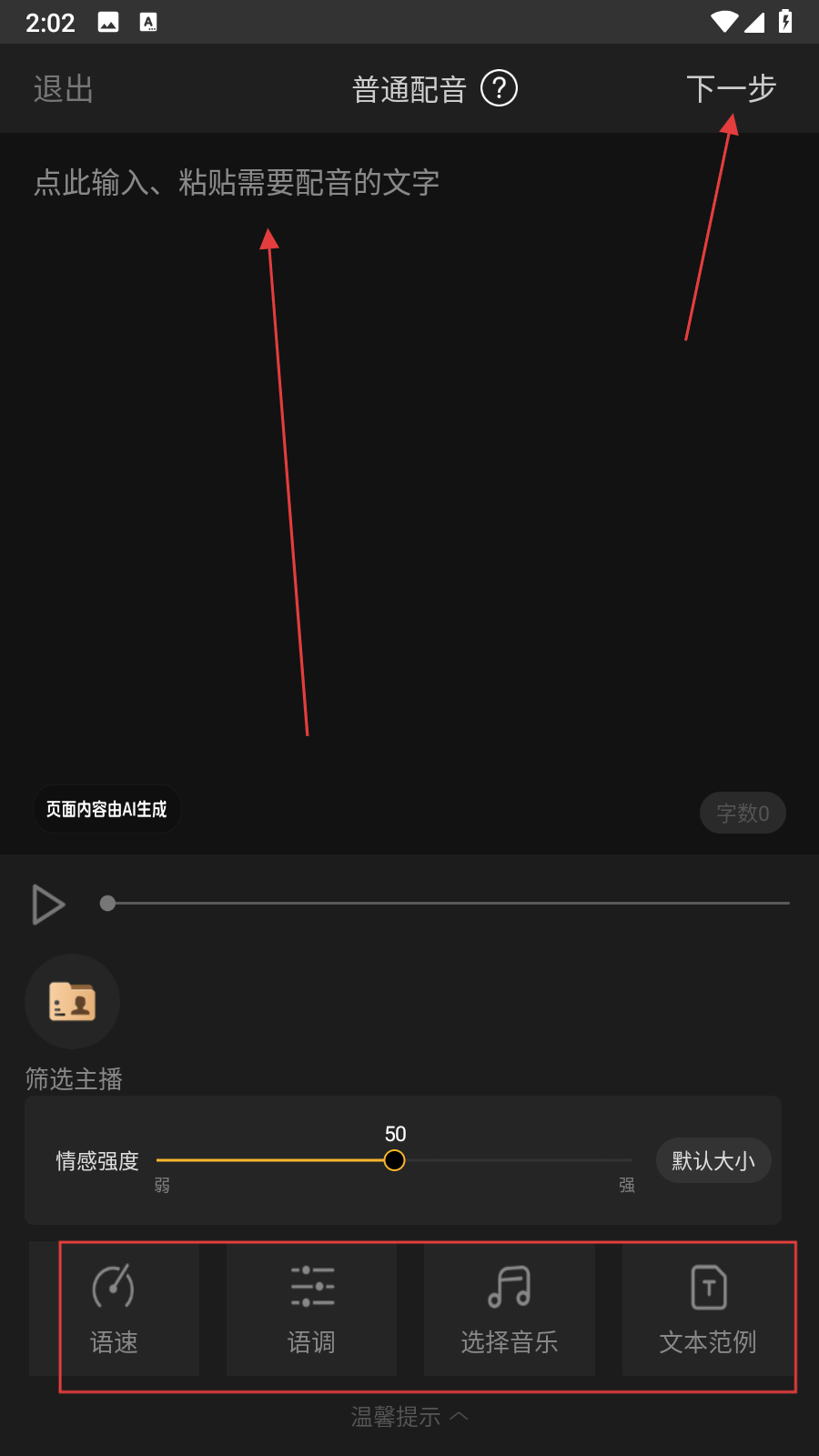 2、在編輯界面輸入需配音的文字,下方調(diào)節(jié)情感強(qiáng)度、語速、語調(diào),也可選擇音樂或查看文本范例,設(shè)置完成后點(diǎn)擊右上角下一步。