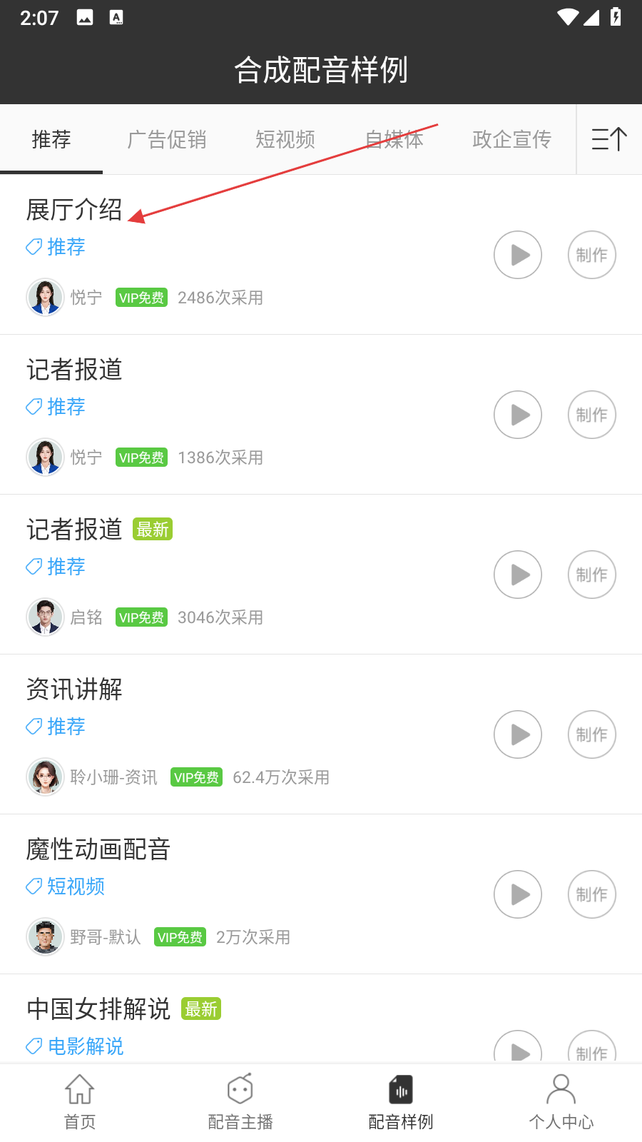 1、打開訊飛配音應用,點擊底部配音樣例選項,在推薦、廣告促銷等分類中找到目標模板,點擊進入案例試聽頁面。