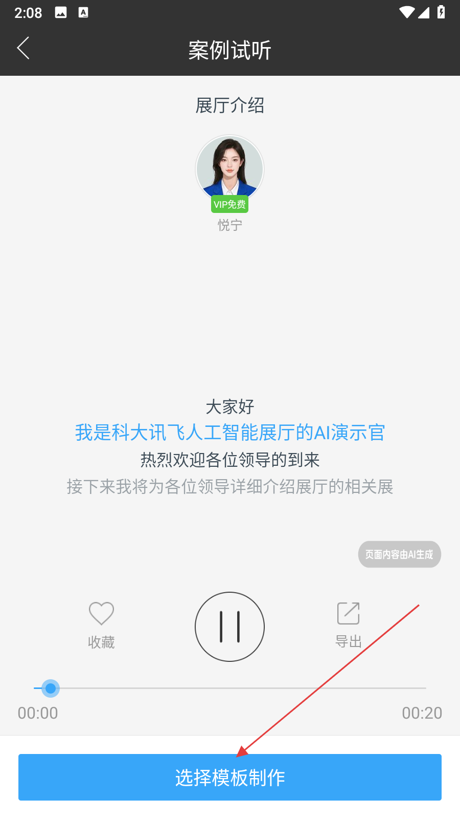 2、在案例試聽頁面,試聽模板音頻效果,點擊底部選擇模板制作按鈕,跳轉(zhuǎn)至普通配音編輯頁面,模板文本自動填入輸入框。