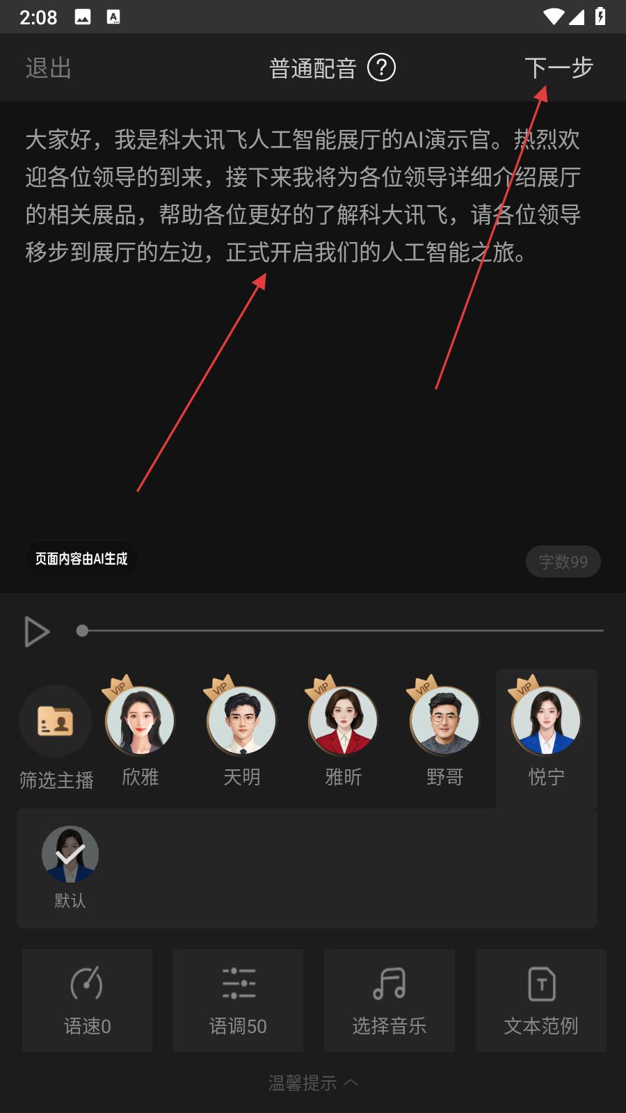 3、在編輯頁面選擇主播、調(diào)節(jié)語速語調(diào)、添加背景音樂,確認文本無誤后點擊右上角下一步,等待系統(tǒng)合成配音并保存使用。