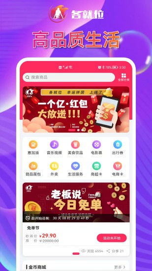 各就位軟件是一款能夠找到超多生活類型商品的手機(jī)購物軟件,在這里用戶們能夠快速的找到超多的商品進(jìn)行購買,還有外賣、美食、電影、出行、超市、娛樂、加油等等等等生活服務(wù)也能夠在這里找到,讓您能夠同伙軟件享受到便捷的生活,超級(jí)好用,軟件上還有非常多的優(yōu)惠券幫助用戶在購物時(shí)省錢。