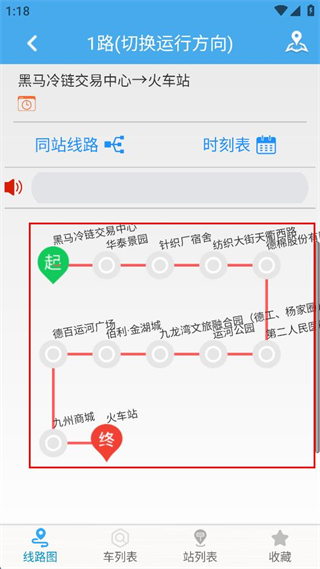 4、在1路公交詳情頁面查看線路圖,了解從黑馬冷鏈交易中心到火車站的站點分布。