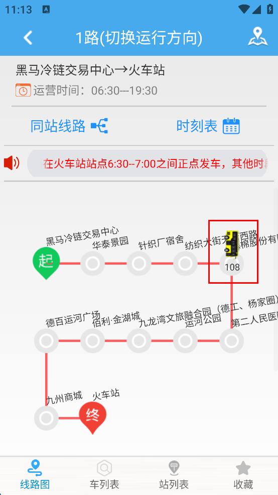 4、進(jìn)入1路公交詳細(xì)信息頁(yè)面后,能查看其運(yùn)營(yíng)時(shí)間、同站線路、時(shí)刻表以及線路圖等內(nèi)容,清楚了解1路公交的運(yùn)行情況。
