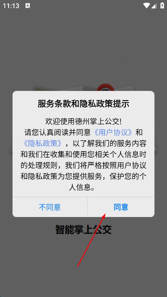 1、打開德州掌上公交,彈出服務(wù)條款和隱私政策提示,認(rèn)真閱讀相關(guān)內(nèi)容后,點(diǎn)擊“同意”按鈕,進(jìn)入應(yīng)用主界面。