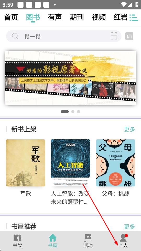 1、打開職工書屋App,進(jìn)入首頁后,點(diǎn)擊底部導(dǎo)航欄中的個(gè)人選項(xiàng)。