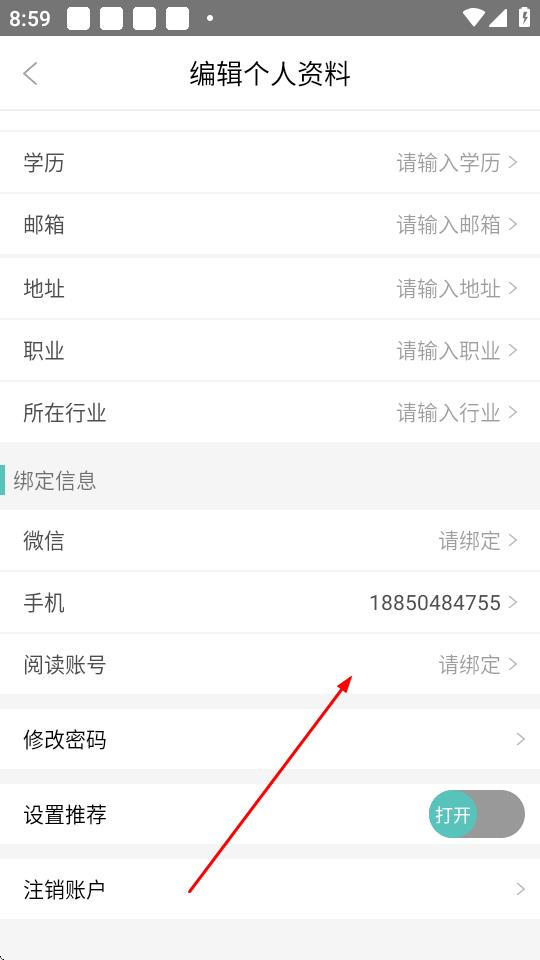 3、進(jìn)入設(shè)置相關(guān)界面后,下滑找到綁定信息板塊,點(diǎn)擊閱讀賬號(hào)選項(xiàng)。