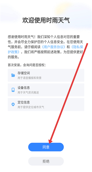 1、在時(shí)雨天氣的“用戶服務(wù)協(xié)議與隱私保護(hù)政策”彈窗點(diǎn)擊“同意”,進(jìn)入“添加城市”頁(yè)面。