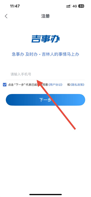 4、在頁面輸入手機(jī)號,勾選閱讀并同意相關(guān)協(xié)議,點(diǎn)擊下一步,按提示完成后續(xù)操作。