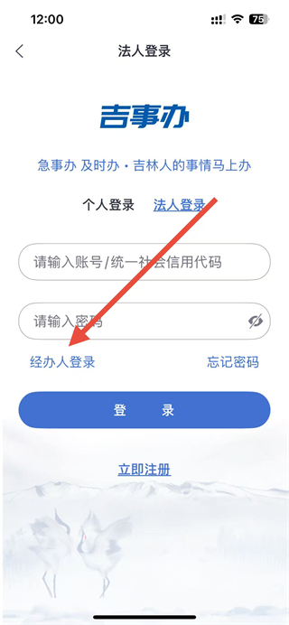 3、在法人登錄頁面,點(diǎn)擊經(jīng)辦人登錄選項(xiàng),進(jìn)入經(jīng)辦人登錄頁面。