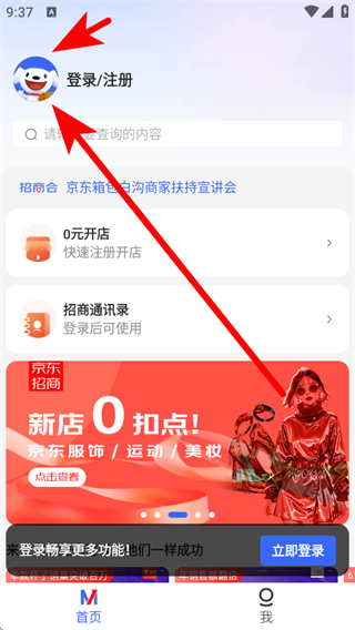 1、打開京麥APP,我們需要點擊左上角登錄/注冊的圖標。