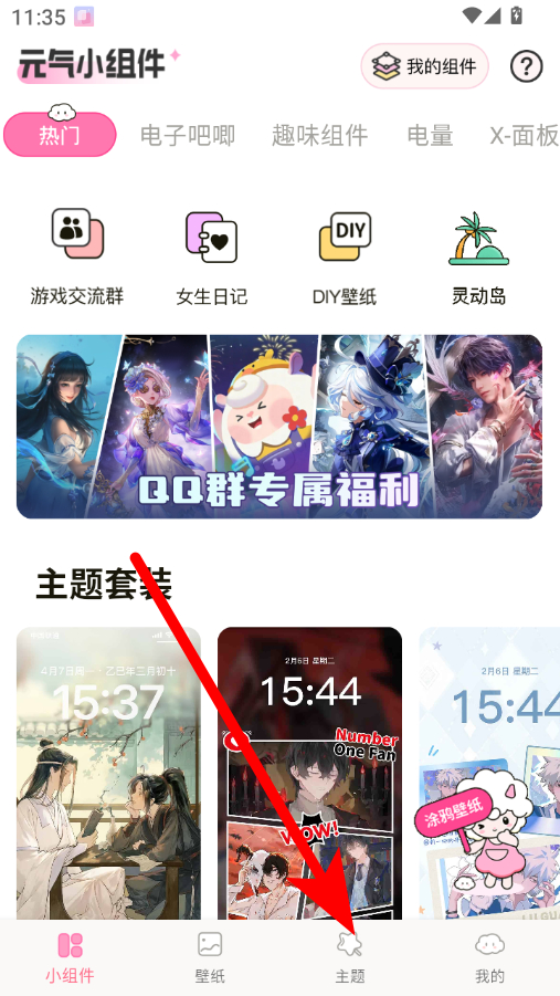 1、在元氣小組件app首頁,點擊底部主題選項,進入主題頁面。
