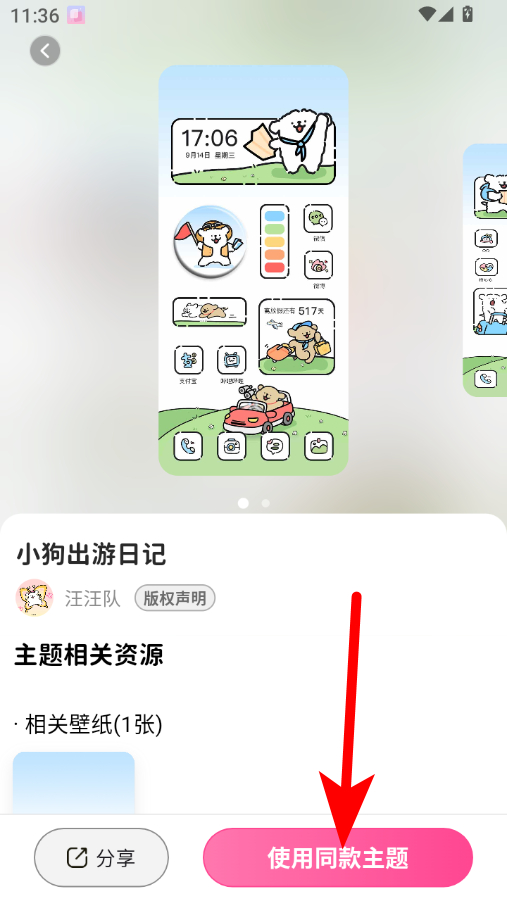 4、在主題詳情頁面,點擊使用同款主題按鈕,即可更換主題背景。