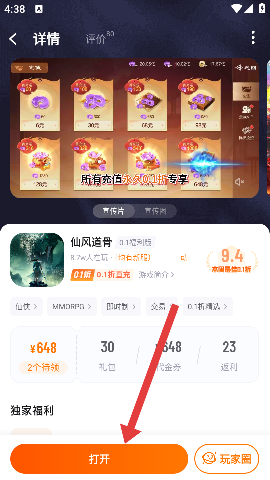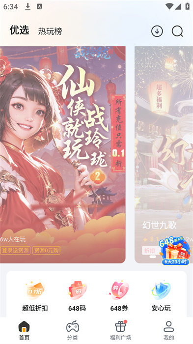 1、下載完成軟件之后,我們在軟件首頁界面可以看到非常多的功能,比如【超低折扣】點擊進入該功能之后就可以看到都是0.1折的游戲;