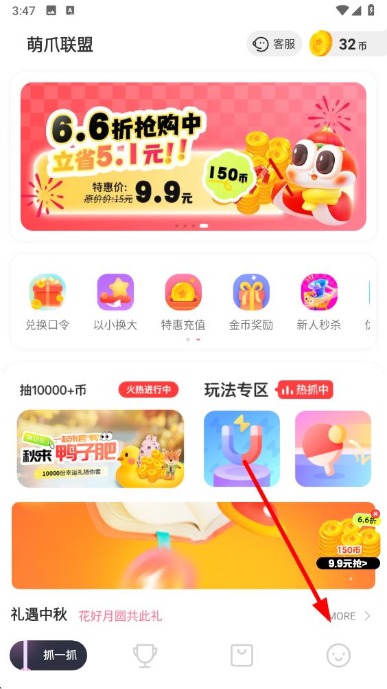 1、打開萌爪聯(lián)盟app,進入主界面,點擊底部導(dǎo)航欄中的個人圖標,進入個人界面。