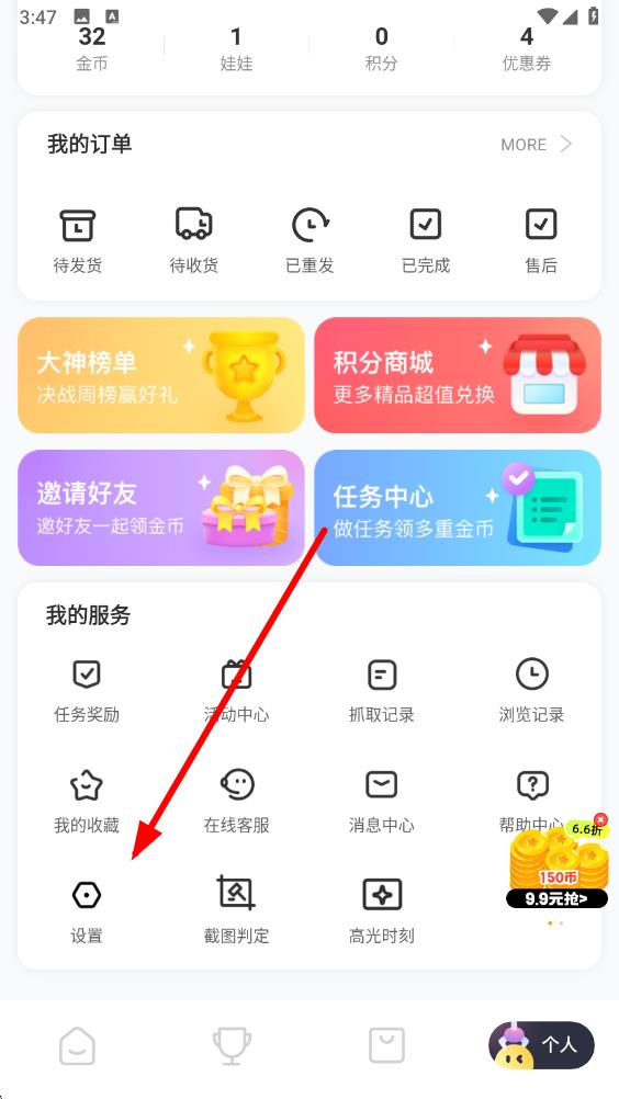 2、在個人界面中,向下滑動頁面,找到并點擊設(shè)置選項,進入設(shè)置頁面。