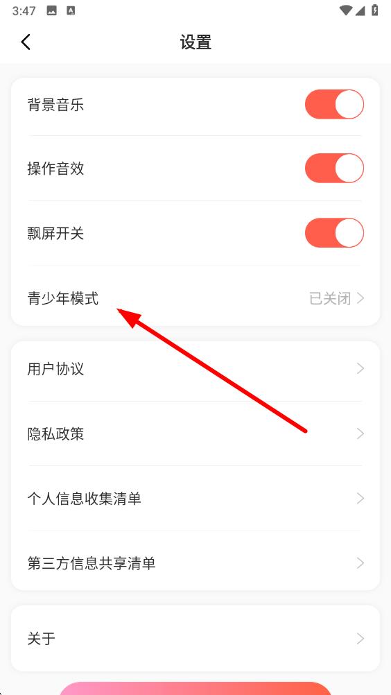3、在設(shè)置頁面里,找到青少年模式選項并點擊,進入青少年模式設(shè)置界面。