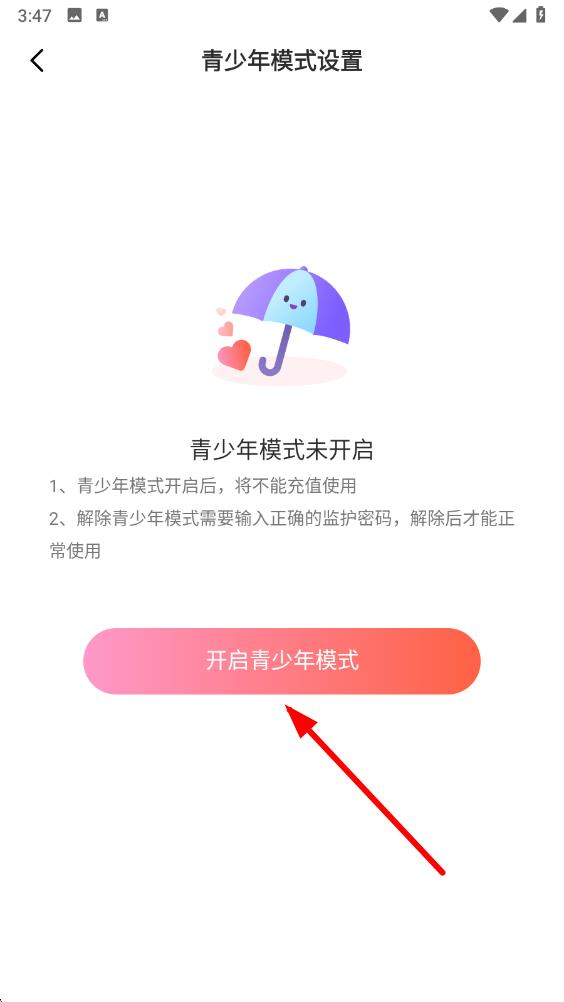 4、在青少年模式設(shè)置界面中,點擊開啟青少年模式按鈕,按照提示操作后,即可成功開啟青少年模式。