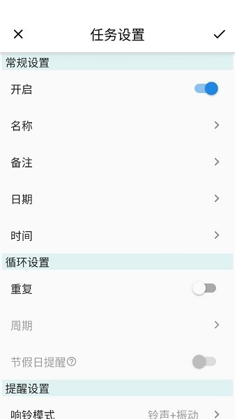 周期鬧鈴提醒功能。如:按年、月、周、日、小時、間隔循環(huán)設(shè)置鬧鈴提醒。提供每年生日、每月按揭、每周早起、每幾天換班等生活場景需求;