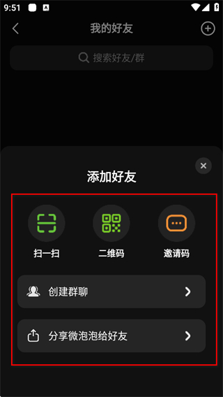 3.彈出添加好友選項(xiàng),可選擇掃一掃、二維碼、邀請碼等方式添加好友,也可創(chuàng)建群聊或分享微泡泡給好友。