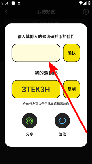 4.若選擇邀請碼方式,輸入他人的邀請碼后點(diǎn)擊確認(rèn)即可添加好友。