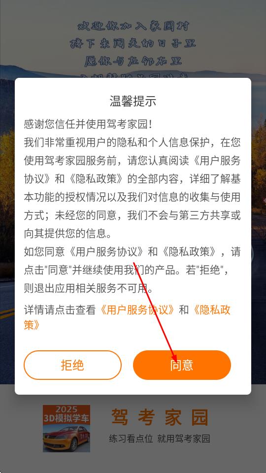 1、打開駕考家園APP,在彈出的溫馨提示頁面,點(diǎn)擊同意。
