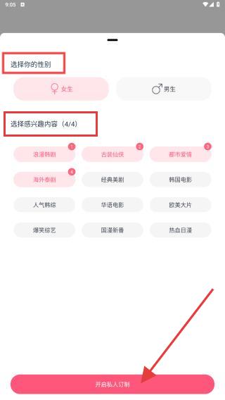 1、打開應(yīng)用后,先選擇性別,再選擇興趣內(nèi)容,選完后點擊底部開啟私人訂制按鈕。
