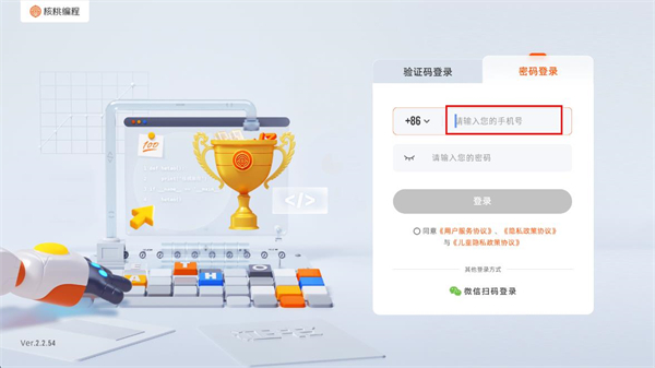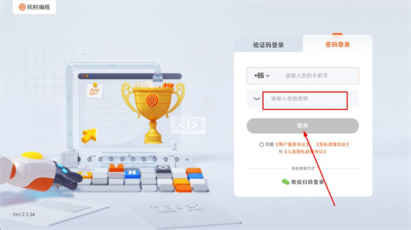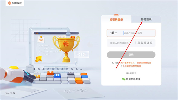 1、打開核桃編程app,點擊上方密碼登錄選項。