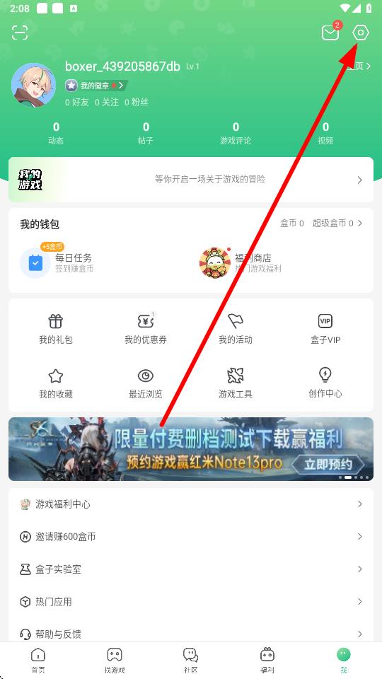 1、進(jìn)入4399游戲盒我頁面,點(diǎn)擊右上角設(shè)置圖標(biāo)進(jìn)入設(shè)置界面。