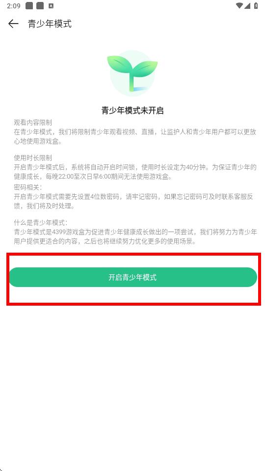 3、在青少年模式頁面點(diǎn)擊開啟青少年模式按鈕,按提示設(shè)置4位數(shù)密碼即可開啟。