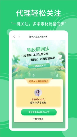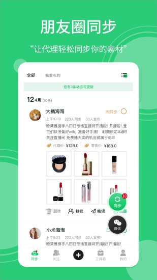 2、一鍵同步,一鍵即可將他人的素材進行同步,快速的發(fā)布到自己的朋友圈中。