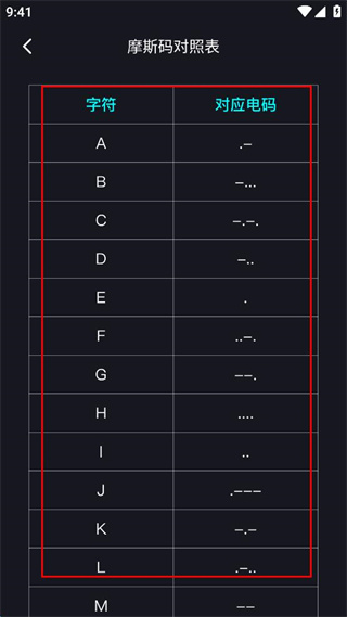 3、在摩斯碼對照表界面中,查看A到L等字符對應的電碼內容。