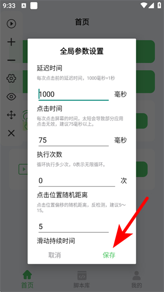 3、設置延遲時間、點擊時間等參數后,點擊保存,完成設置操作。